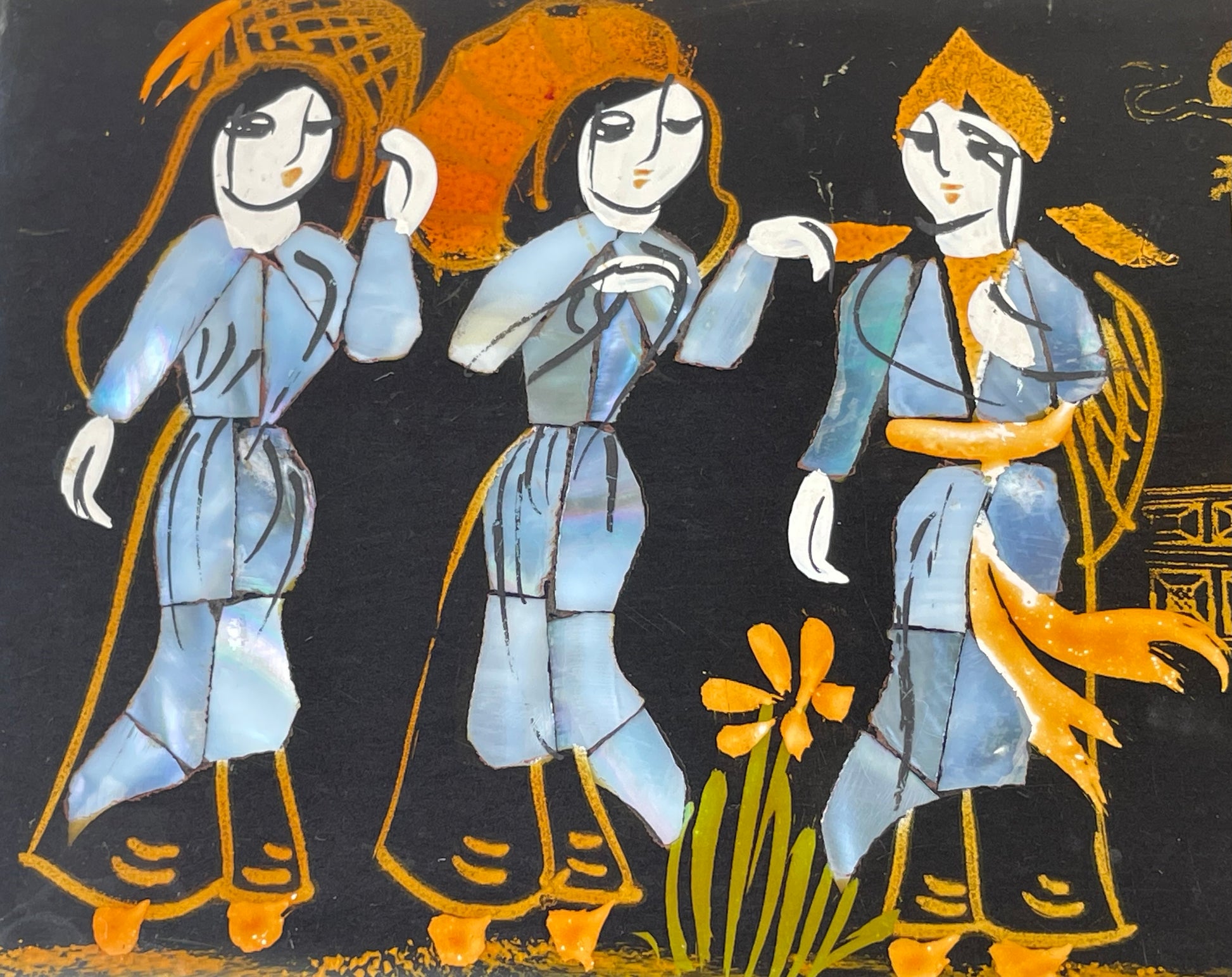 Black lacquered jewellery box depicting three inlaid mother of pearl dancing figures.
